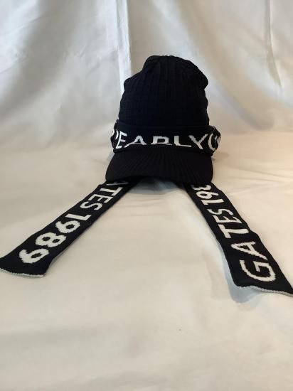 【パーリーゲイツ】ロゴマフラー付きつば付きニット帽 ネイビー